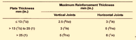 d) The reinforcement of the welds on all butt joints on each side of the plate shall not exceed the following thicknesses: